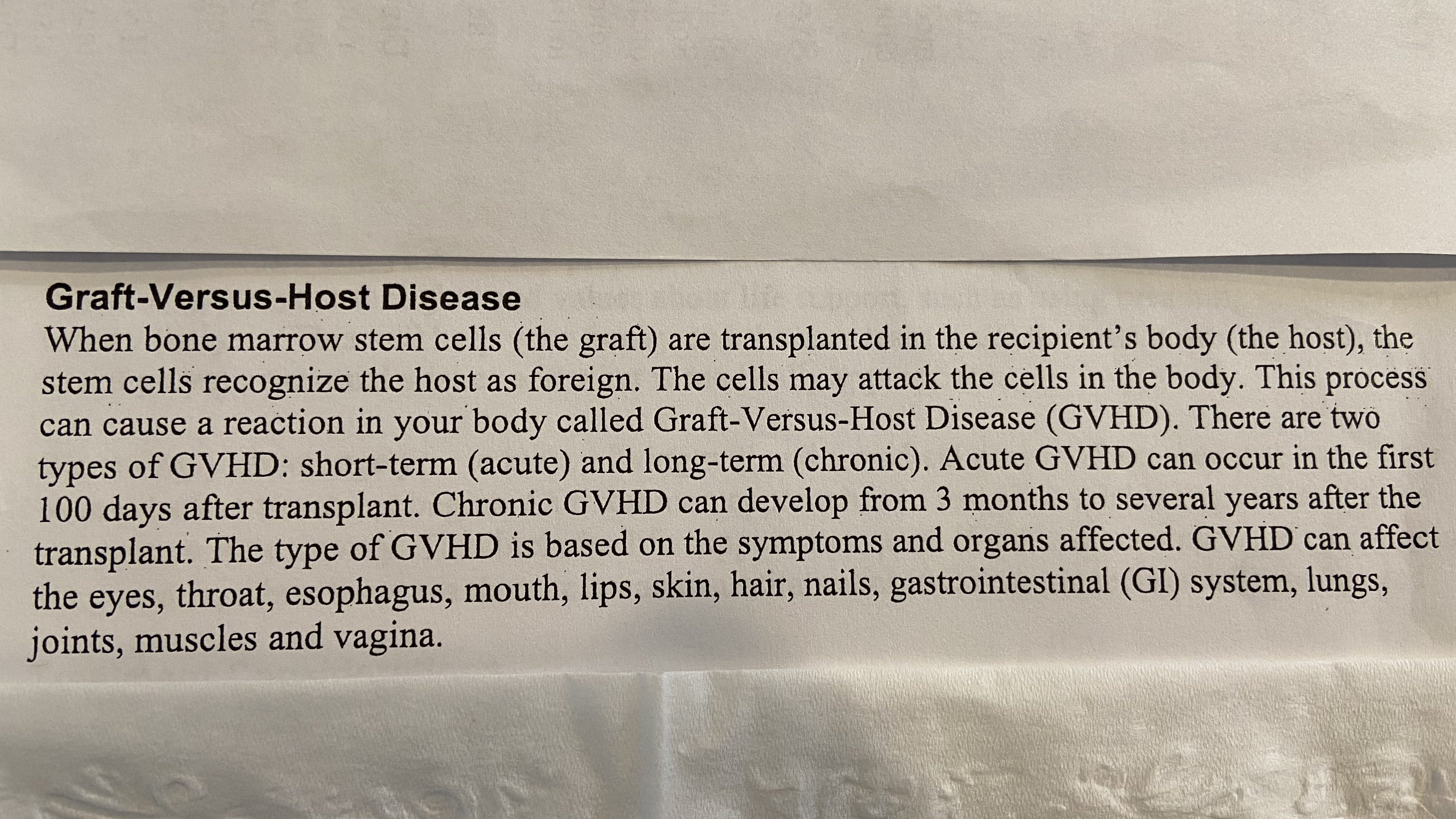We still have to stay in Houston so the team can monitor me for Graft versus Host Disease (always a transplant possibility). This is rejection by my body of the donor cells. *(See paragraph below for more info)* Although there is no indication of this currently, it is still possible so in Houston we stay.