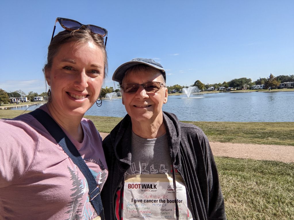 On Saturday, we held a Boot Walk in our park for locals to raise money for MD Anderson research. There were seven walkers and overall with donations from family and friends, we raised more than $700. It was a beautiful day for a walk. After a rest, we started a 500 piece round puzzle. Again more conversations while we worked on the puzzle.